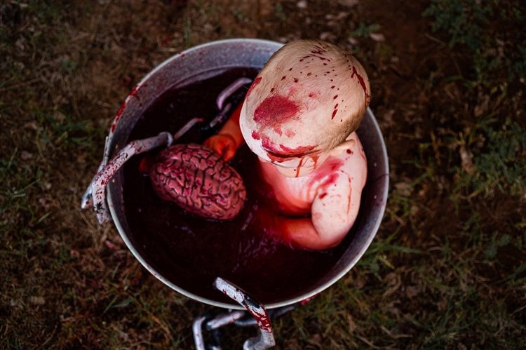 When there are zombies, there’s going to be blood. There was plenty of that, or at least what looked like blood, in photos taken by Oklahoma mom Bobbi Rylant of her baby. The photo portrayed her baby sitting in a bucket of fake blood while eating a brain like a zombie would.